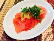 ![]() 皿に、トマトを盛り、ドレッシングをかけ、青しそを天盛りにする。