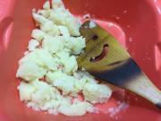 ![]() じゃが芋は皮をむき、ラップに包み、レンジで加熱する。 (1個120gで3分くらい) ボウルに入れ、木べらで軽くつぶす