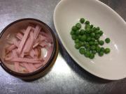 ![]() ハムは短冊切りにする。 グリンピースは耐熱の皿に入れ、水をふりかけレンジで加熱する。