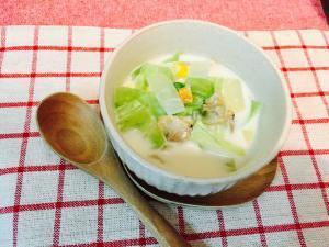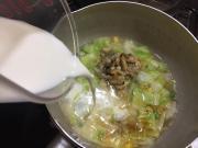 ![]() 野菜がしんなりしたら、あさり、固形コンソメ、牛乳を加えひと煮立ちさせる。味見をして、塩、こしょうで味を調える。