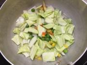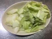 ![]() キャベツは2cm角のざく切り、玉ねぎは粗めの角切りにする。