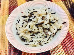 ![]() 洗ったお米に定量の水を加え、ひじきを加え、炊く。