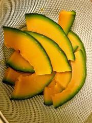 ![]() ①薄く切ったカボチャと水をボウルに入れ、500Wの電子レンジで5分加熱し、水を切っておく