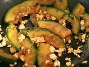 ![]() ②中火で熱して油をしき、豚挽肉を炒めた後①のカボチャを炒め、オイスターソース、ケチャップを混ぜ合わせたものを加える。