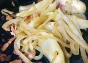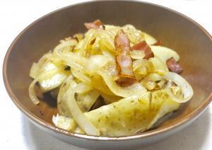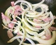 ![]() フライパンに油をしいて中火でベーコンとタマネギ(細切り)を炒め、タマネギがしんなりしたらコンソメと胡椒を加える