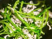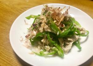 ![]() ピーマン(細切り)を加え、塩、カツオ出汁、胡椒で味付けして、強火でさっと炒めて、最後に鰹節をちらす