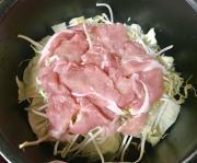 ![]() 鍋にキャベツ、モヤシ、エノキ、豚肩ロース(各一口大)の順に重ね入れ、カツオ出汁、酒を全体にかけ、鍋に蓋をして10分蒸す