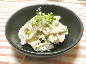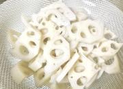![]() レンコン(イチョウ切り)を鍋に湯を沸かし、レンコンを1分半程度茹でる。火が通ったら、ザルに上げ、冷蔵庫で冷やしておく