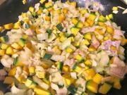 ![]() フライパンにバターをしき、玉ねぎ(みじん切り)を炒め、しんなりしてきたら、ハム(角切り)とカボチャ(角切り)を加える