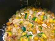 ![]() 炊飯器に【1】と米、大豆、コーン、コンソメ、水、塩、胡椒を入れて、白飯同様に炊く