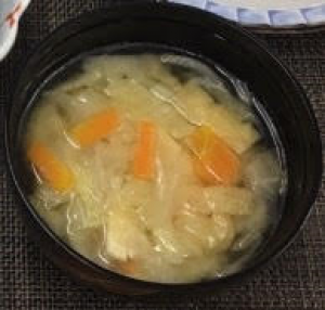沸騰しただし汁の中に大根、人参、白菜を入れて、火が通れば、豆腐と油揚げを加えて、柔らかくなるまで中火で煮る。