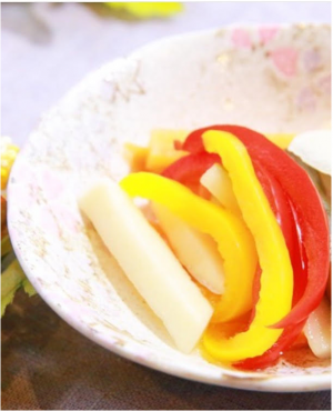 パプリカは、縦に3,4等分して、ヘタと種を取ってから、横に8mm幅に切る。フライパンで油をひかずに素焼きにする。