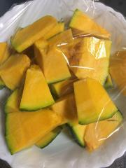 ![]() かぼちゃは一口大に切り、水をかけてラップをし、600wで5〜6分加熱する。