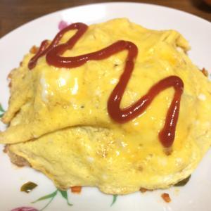 卵に牛乳を加えてよく混ぜ、バターを溶かしたフライパンで焼く。チキンライスの上にのせる。
