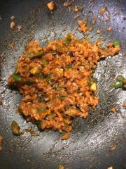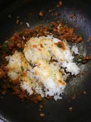 ![]() ケチャップの水分が飛んだらご飯を加えて切るように混ぜる。