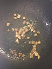 ![]() フライパンにサラダ油を熱し、鶏肉を炒める。
