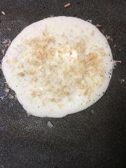 ![]() 生地の縁が茶色くカリカリしてきたらひっくり返す。ヘラで押さえて蓋をする。