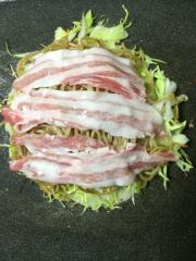 ![]() 千切りのキャベツ、もやし、天かす、チーズ、そば、豚バラの順にのせる。繋ぎとして生地を少しかける。