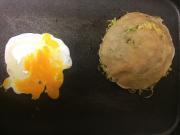 ![]() 隣に卵を落とし、ヘラで丸く広げる。豚バラの面を下にしたまま、広げた卵の上にのせる。