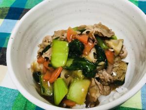![]() Aの材料を入れて沸騰してから3分ほど煮る。盛り付ける直前に水溶き片栗粉でとろみを付けたら、丼のご飯にかけて完成。