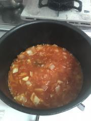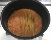 ![]() 水を入れて沸騰した所にパスタを加え、水分を飛ばしながら茹でる。(ソースが無くなってもパスタが固ければ水を少しずつ足す)