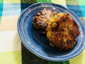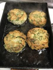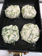 ![]() フライパンにごま油を引き、整形した団子を乗せ中火で焼く