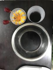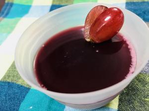 ![]() 1のブドウで液体をすくい、艶出しに立てて冷蔵庫で冷やす。大さじ1杯分を耐熱容器に入れて、残りを大きめのボウルに入れる