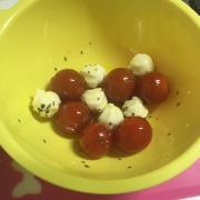 ![]() ヘタをとったミニトマトとチーズを、オリーブオイルとバジルで和える。