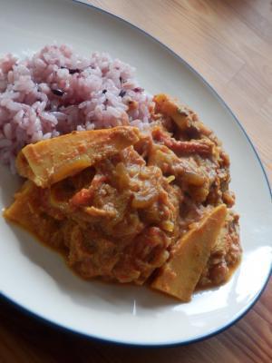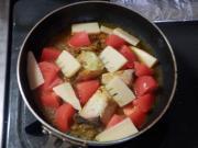 ![]() たけのこ、トマト、水を加え、中火で7-10分程度煮る。