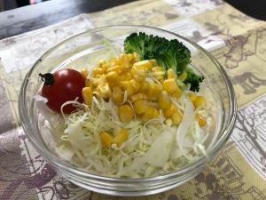 キャベツを器の1番下に敷き、トマト、ブロッコリー、コーンを乗せる。