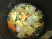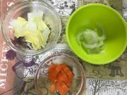 ![]() 人参は短冊切り、白菜はざく切り、たまねぎはスライスし、それぞれ電子レンジにかける。