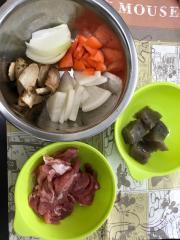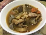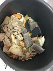 ![]() 玉ねぎはスライス、人参と大根はいちょう切り、ごぼうは斜めにスライスし大きいものは半分に切る。こんにゃくは一口大に千切る。