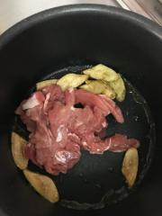 ![]() ごぼうが香ばしくなったらフライパンに豚肉を入れ炒める。
