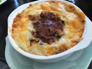 ![]() 耐熱のお皿にご飯、ホワイトソース、ミートソース、チーズの順で盛り付ける。