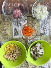 ![]() ベーコンは短冊切り、人参とたまねぎはみじん切り、きのこは半分に切る。 人参とたまねぎはレンジで加熱する。