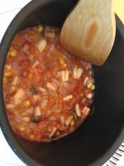 ![]() 鍋に水とトマト缶、コンソメを入れ火にかける。