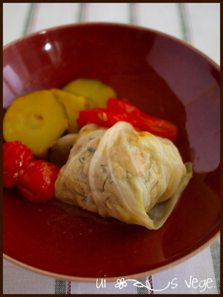 ロールキャベツが出来たら、冷ましておいた野菜を添えて出来上がり。