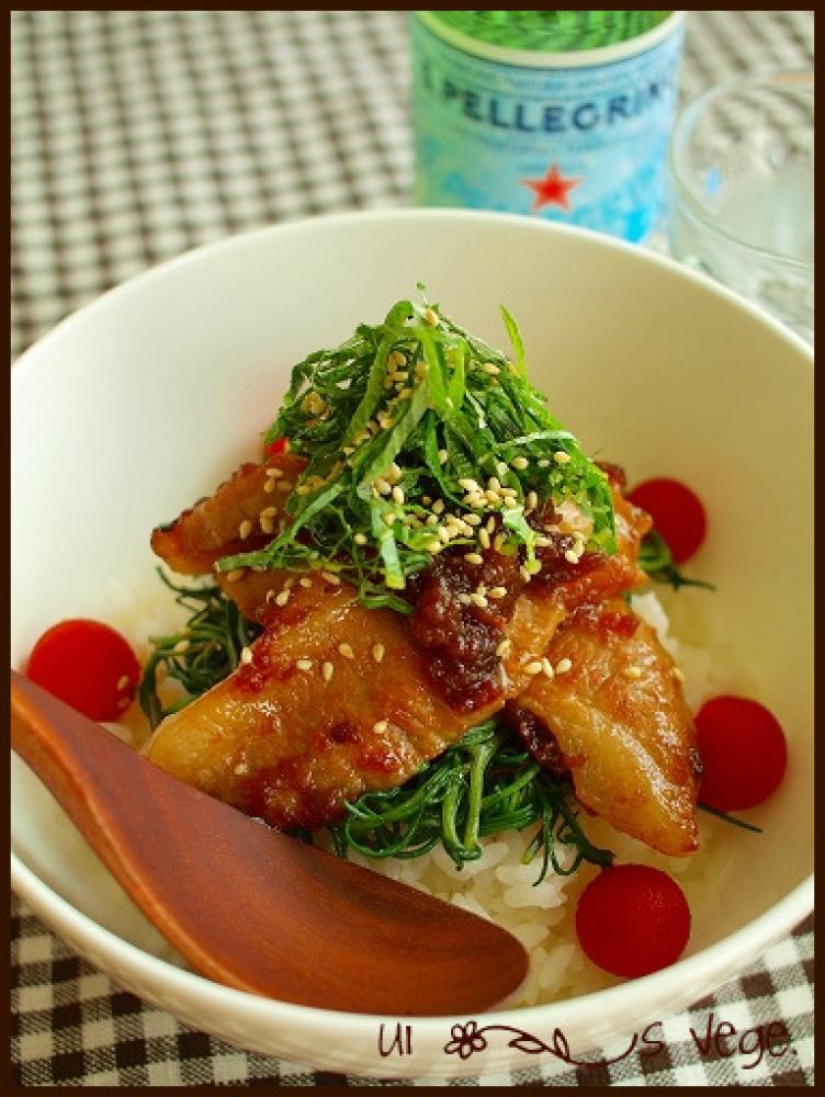 どんぶりにごはん・おかひじき・お肉の順に乗せ最後に残ったタレをかけ大葉をのせトマトを散らして出来上がり。