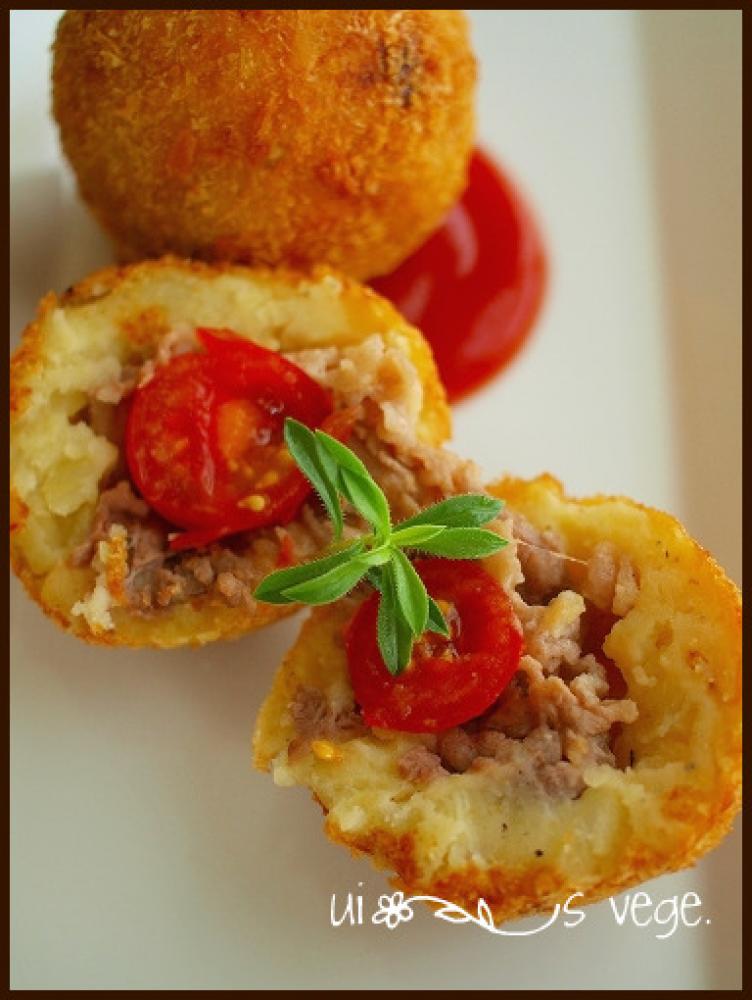 冷えたジャガイモでトマト肉巻きを包むようにして、すき間が出来ないようにジャガイモで覆い丸くする。