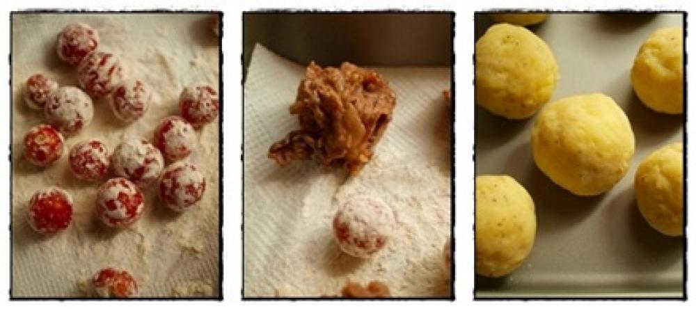 ![]() ジャガイモで包んだらその周りに薄力粉を振るい、溶き卵にくぐらせパン粉をつけて揚げたら出来上がり。