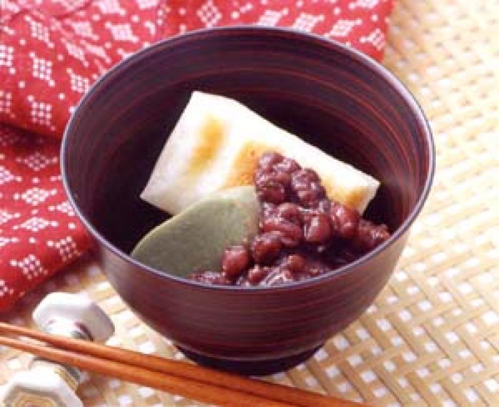 もちとよもぎ麩を焼き、切り分けて椀に盛り、その上から(5)をかける。