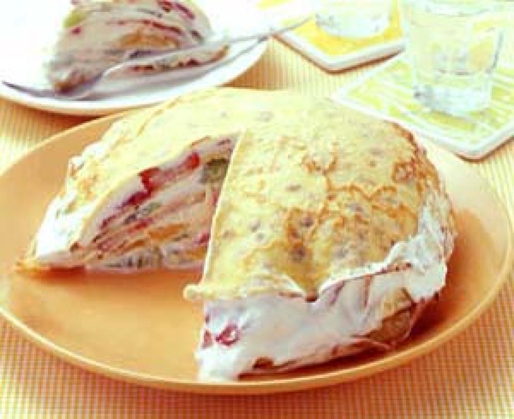 (11)の上からクリームを塗り、クレープ、フルーツの順に重ねていき、ドーム型に整える。