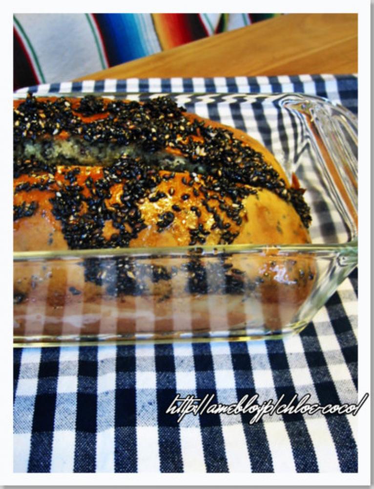 ![]() 170℃に熱したオーブンで約35分焼く。焼成開始15分で一度取り出し(B)飾り用のごまを上に塗り、残り時間で焼成する。