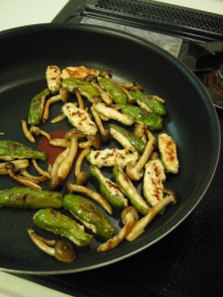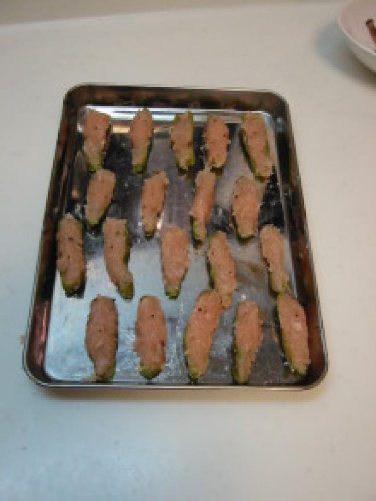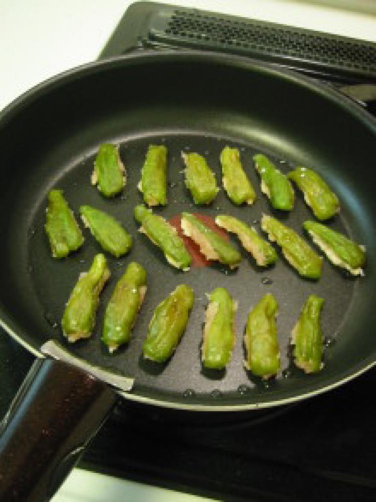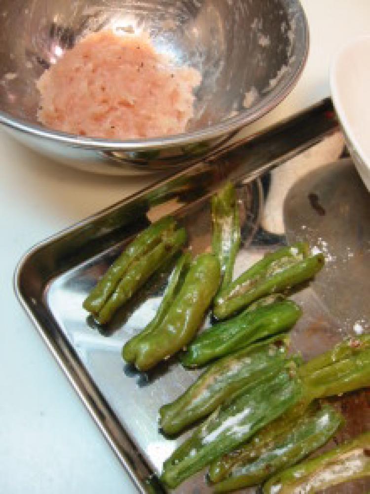 ![]() 下準備したしし唐にささみを押し込むように詰める。