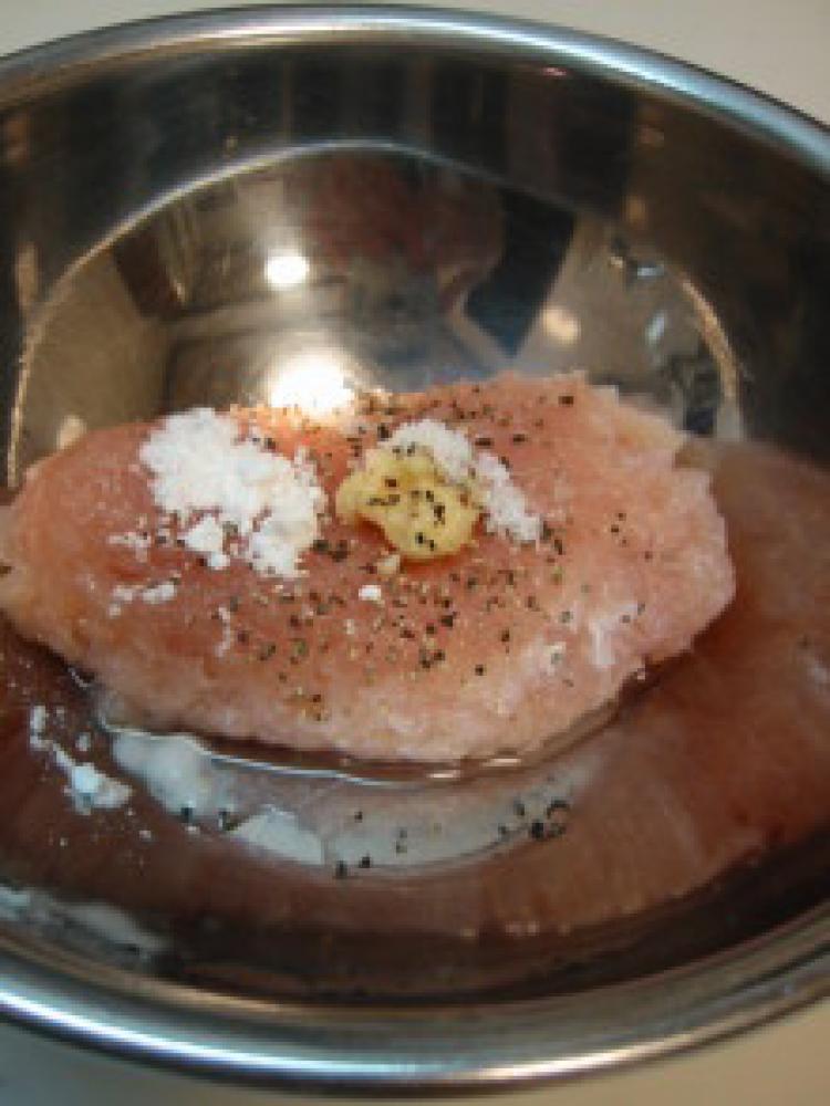 ![]() 下準備①ささみをたたいてミンチ状にしたら、(B)の材料を加え粘りが出るまでよく混ぜる。
