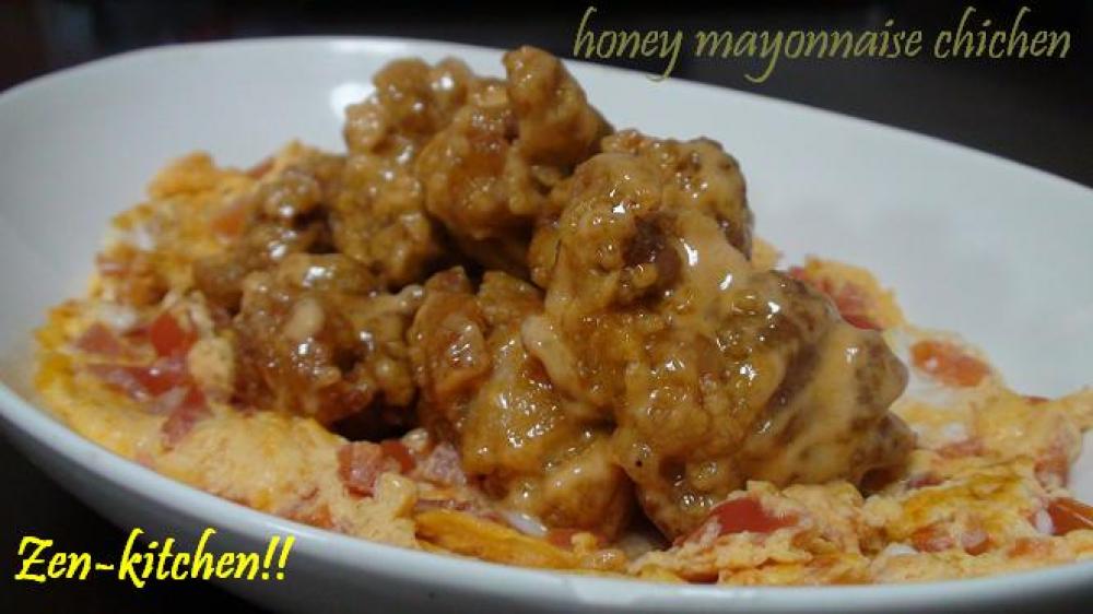 揚げたての鶏肉に<ハニーマヨネーズソース>を絡ませて出来上がり!!