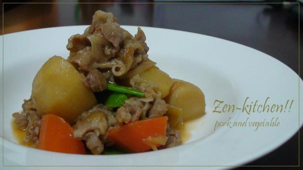 鍋にサラダ油少々(分量外)を入れ、お肉を炒める。火が通ったら、じゃがいも、にんじん、玉ねぎを入れて表面を炒める。