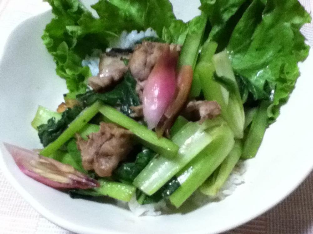 ![]() ご飯の上に、先にオイスターソースで炒めた豚肉と小松菜を盛りつける。