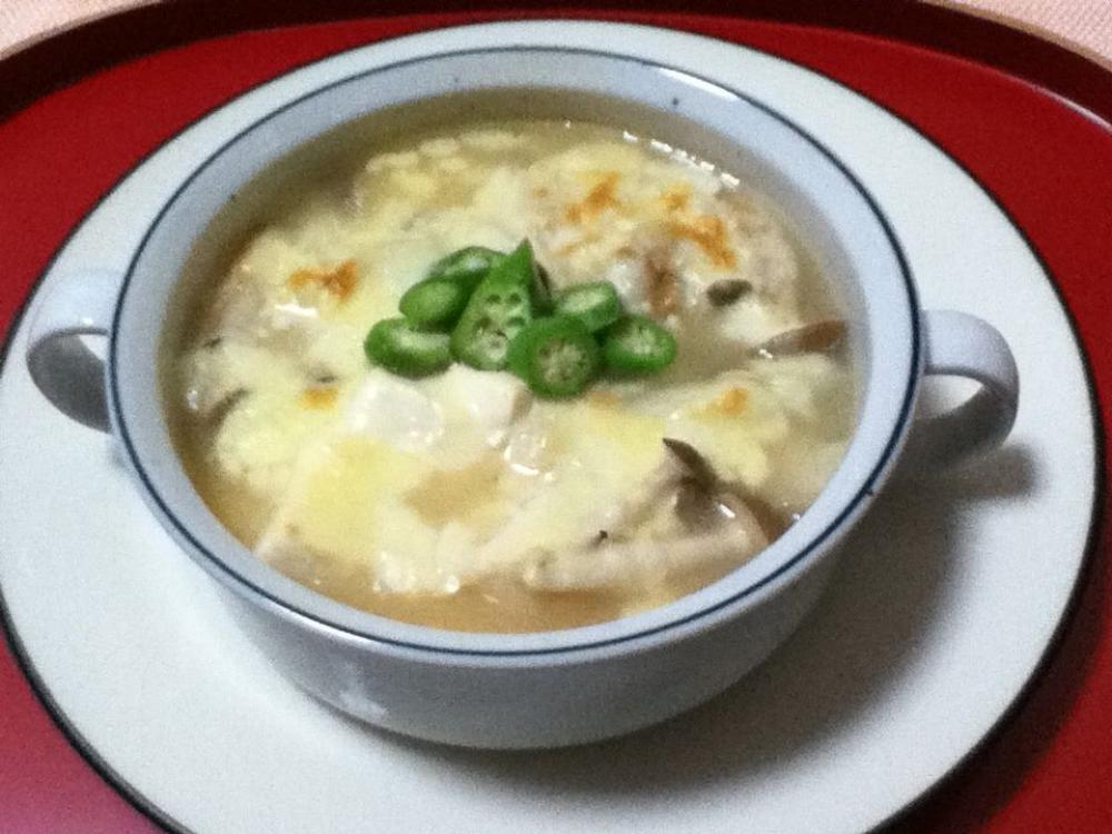 ![]() マンナンヒカリと豆腐をいれ沸騰したら火をきって、お皿に移し、上からチーズとオクラをかける。