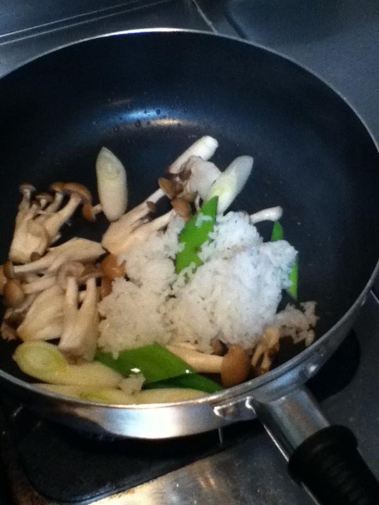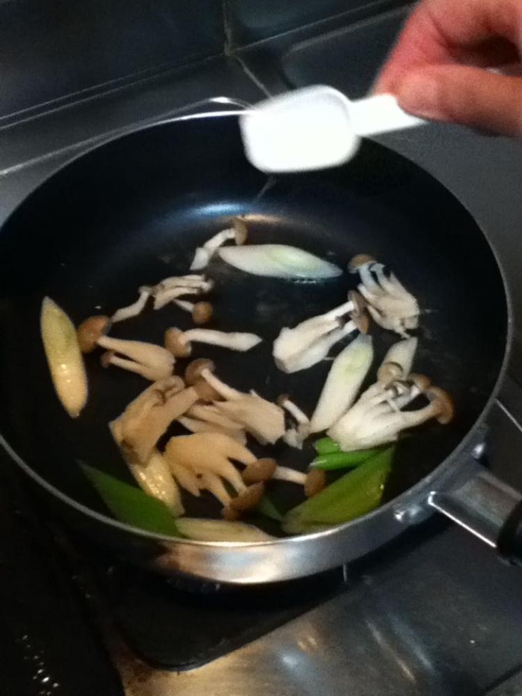 ![]() 焦げ目がついてきたら、ぶなしめじを入れる。